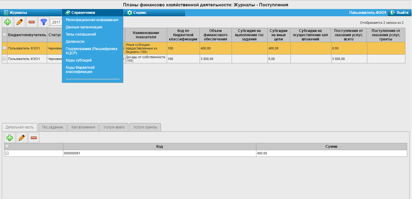 В системе присутствуют справочники: источников финансирования, должностей, групп работников, кодов бюджетной классификации, кодов субсидий, планов ФХД, расшифровки КЦСР, типов соглашений, данных организаций.